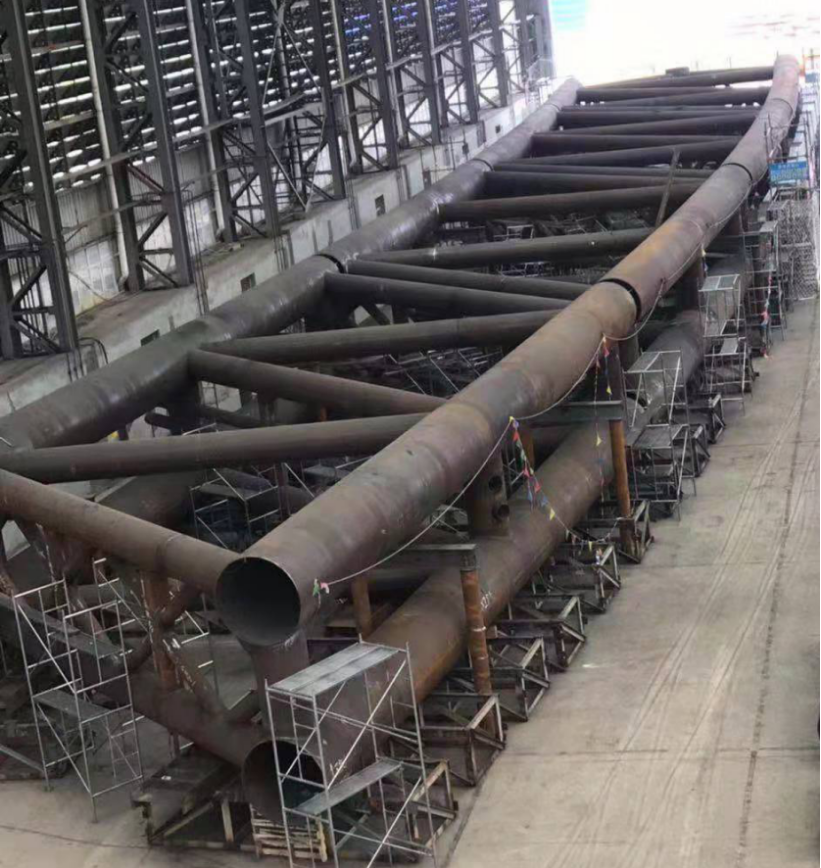 ? 犍為岷江特大橋是公司繼商合杭淮河特大橋、恩施找龍壩特大橋之后承建的又一座特大跨度鋼管混凝土拱橋,主跨457.6米,鋼結(jié)構(gòu)用工程量12000余噸。項目自開工以來公司精心組織,克服了工期緊、任務(wù)重及焊接質(zhì)量要求高等困難,在成熟的施工經(jīng)驗基礎(chǔ)上不斷改進(jìn)細(xì)節(jié)、提升設(shè)備能力、優(yōu)化資源配置、完善工藝方案,先后攻克了Q390D-Z25厚鋼板焊接、相貫線焊縫焊接及修磨、拱肋節(jié)段臥式拼裝工藝控制等技術(shù)難題,優(yōu)質(zhì)高效的完成了主拱肋首輪節(jié)段制造和試拼裝施工,為鋼管拱按期合龍奠定了堅實的基礎(chǔ)。