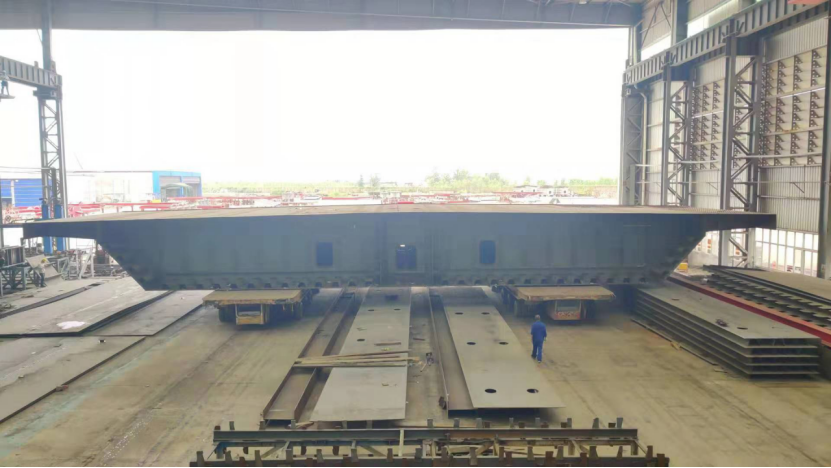 上午11時,隨著現(xiàn)場總指揮一聲令下,重達240余噸的首個鋼箱梁節(jié)段由兩臺150噸自行式液壓平板車緩緩抬起,平穩(wěn)脫離總拼胎架并駛出廠房,標志著首輪6個節(jié)段拼裝完成并正式下胎,轉(zhuǎn)入室外臨時存放區(qū)。