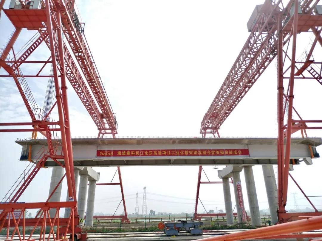 海波要聞丨熱烈祝賀江北東高速項目工業(yè)化橋梁鋼混組合梁首榀吊裝成功