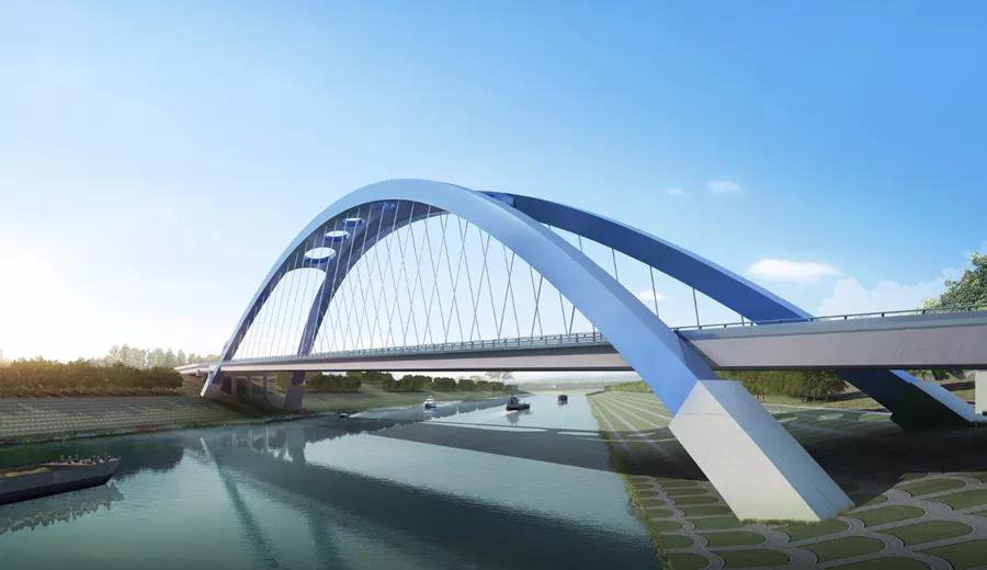 引江濟(jì)淮工程合銅黃高速公路橋,橋位位于安徽省合肥市廬江縣。全橋鋼結(jié)構(gòu)重量為7746噸,是安徽省水利“一號工程”,為地標(biāo)性高速公路橋。主橋采用鋼箱提籃拱橋一跨跨越引江濟(jì)淮工程水域。橋面采用首輪全匹配,其他輪次采用左右側(cè)主梁匹配制造,橫梁做成標(biāo)準(zhǔn)段發(fā)現(xiàn)場安裝,橫梁中間預(yù)留焊接環(huán)縫并加放補(bǔ)償量用于現(xiàn)場調(diào)節(jié)用;拱肋采用48米超高支架架設(shè)的安裝工藝。對全橋整體制造的線形控制精度要求極高。